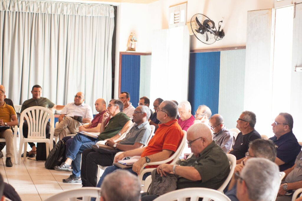 O encontro acontece simultaneamente em dois espaços: no Centro Pastoral Sagrada Família, com a presença dos padres e diáconos, e no Salão São Francisco da Paróquia de São Sebastião, onde participam os colaboradores administrativos.
