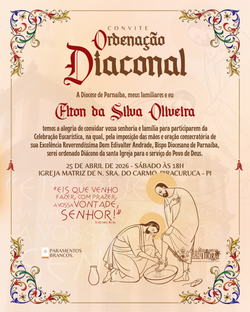 A Diocese de Parnaíba viverá um momento de grande graça e alegria neste sábado, 25 de abril de 2026, com a Ordenação Diaconal do seminarista Elton da Silva Oliveira. A celebração acontecerá às 18h, na Igreja Matriz de Nossa Senhora do Carmo, na cidade de Piracuruca (PI), e será presidida pelo bispo diocesano, Dom Edivalter Andrade.
